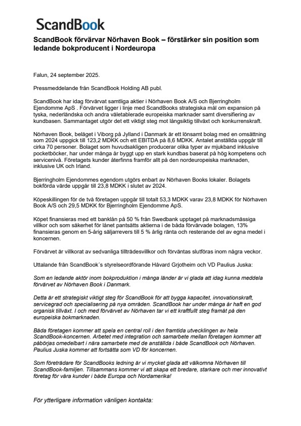 ScandBook har idag förvärvat samtliga aktier i Nörhaven Book A/S och Bjerringholm Ejendomme ApS . Förvärvet ligger i linje med ScandBooks strategiska mål om expansion på tyska, nederländska och andra väletablerade europeiska marknader samt diversifiering av kundbasen. Sammantaget utgör det ett viktigt steg mot långsiktig tillväxt och konkurrenskraft.