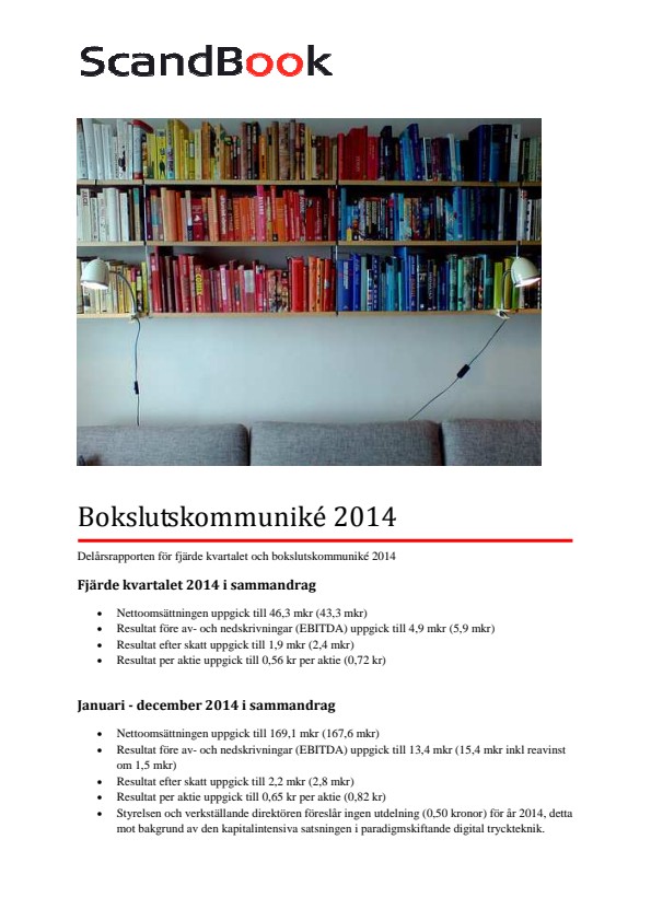 - Styrelsen och verkställande direktören föreslår ingen utdelning (0,50 kronor) för år 2014, detta mot bakgrund av den kapitalintensiva satsningen i paradigmskiftande digital tryckteknik.