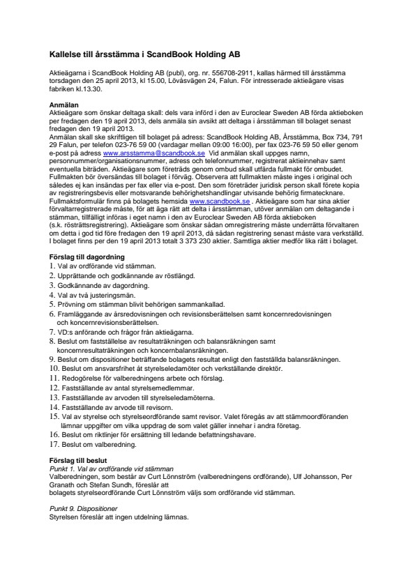Kallelse till årsstämma i ScandBook Holding AB inklusive beslutsförslag