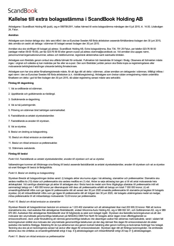 Kallelse till extra bolagsstämma i ScandBook Holding AB