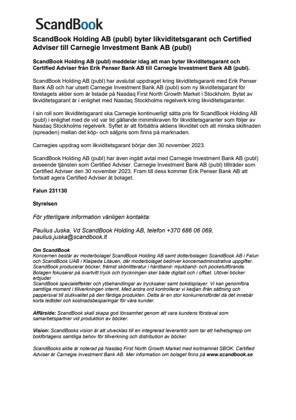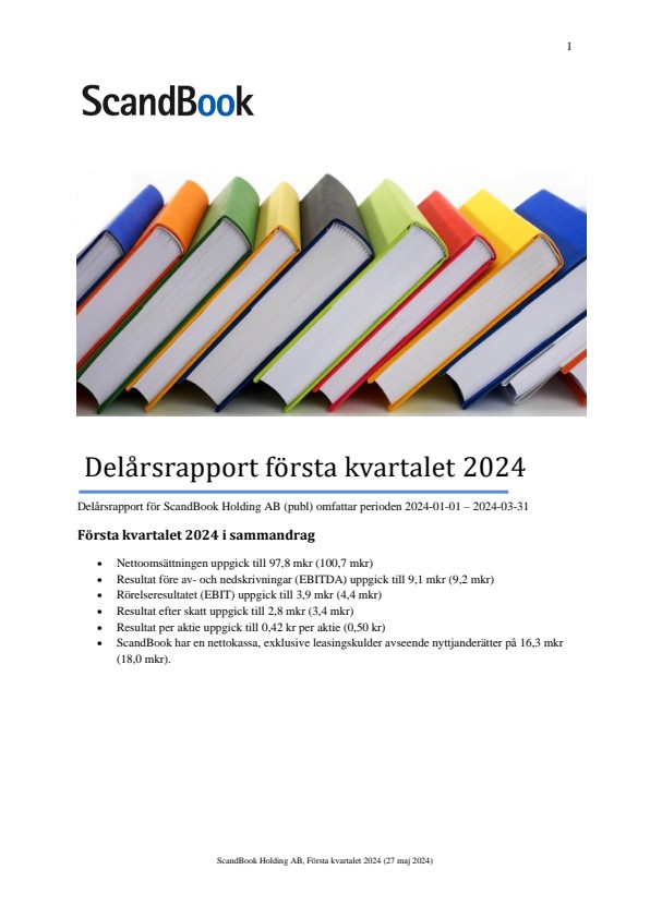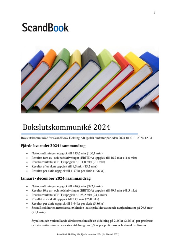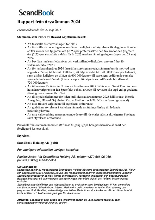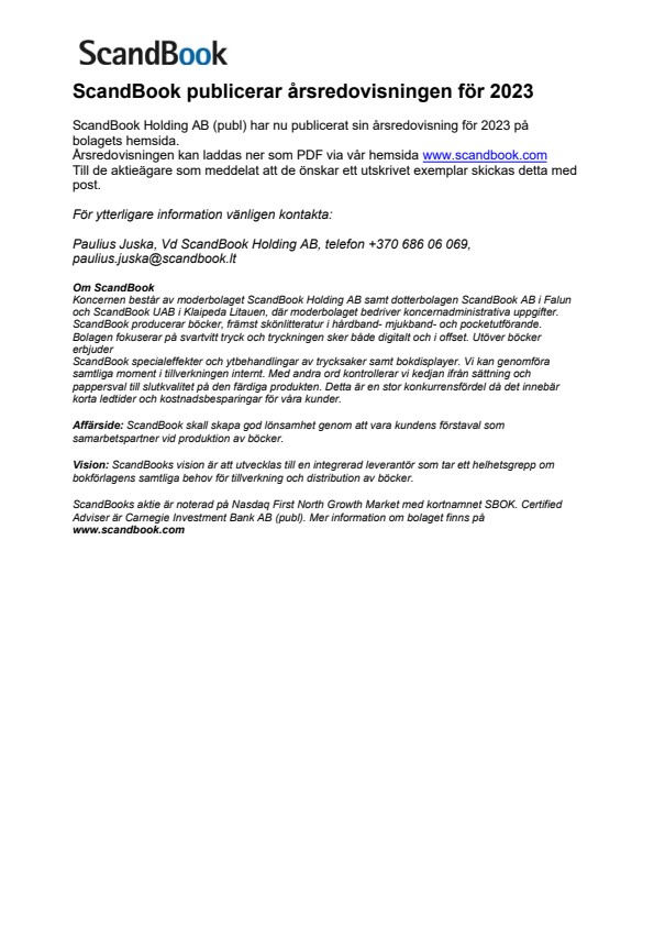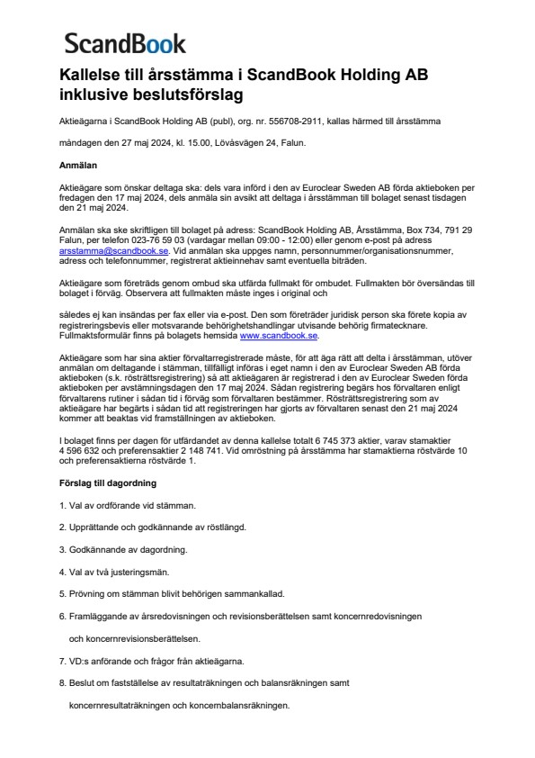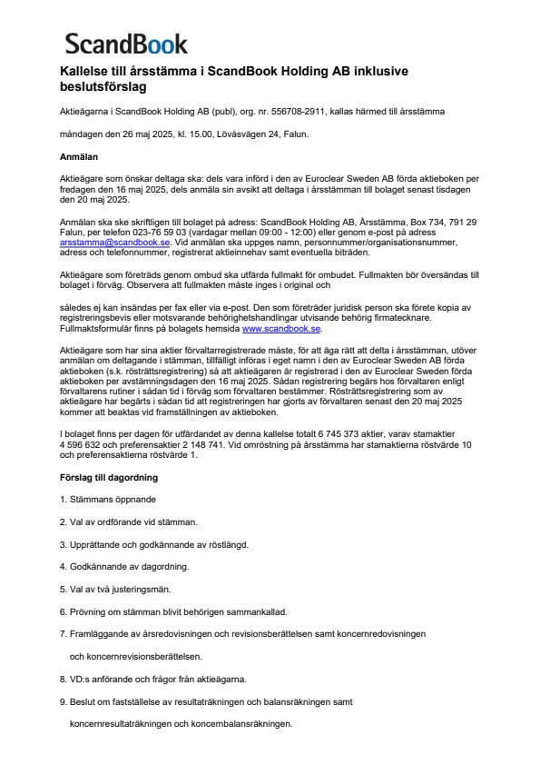 Årsredovisning och revisionsberättelse samt fullständiga förslag avseende punkterna 12-17 kommer senast den 12 maj 2025 att finnas tillgängliga hos: ScandBook Holding AB, Lövåsvägen 24, Box 734, 791 29 Falun, telefon: 023-76 59 00 och sänds utan kostnad till aktieägare som så begär och uppger sin postadress. Årsredovisningen publiceras även på ScandBooks hemsida, www.scandbook.se , i PDF-format.