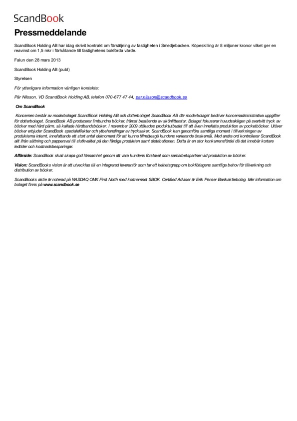 ScandBook Holding AB har idag skrivit kontrakt om försäljning av fastigheten i Smedjebacken. Köpeskilling är 8 miljoner kronor vilket ger en reavinst om 1,5 mkr i förhållande till fastighetens bokförda värde.