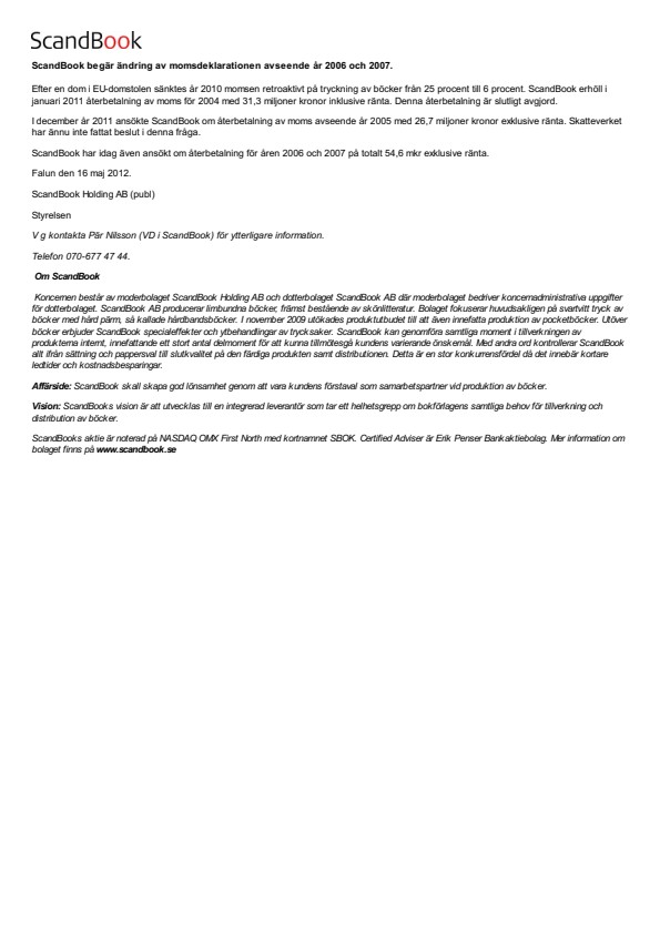 V g kontakta Pär Nilsson (VD i ScandBook) för ytterligare information.