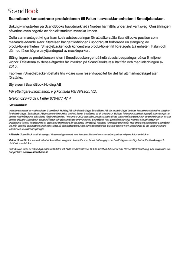 Detta sammantaget tvingar fram kostnadsbesparingar för att säkerställa ScandBooks position som marknadsledande aktör. Styrelsen har gett ledningen i uppdrag att förbereda en stängning av produktionsenheten i Smedjebacken och koncentrera produktionen till företagets två enheter i Falun och därmed få en högre utnyttjandegrad av maskinparken.