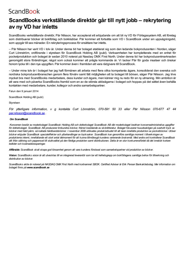 – Pär Nilsson har varit VD i tolv år. Under denna tid har bolaget etablerat sig som den ledande bokproducenten i Norden, säger Curt Lönnström, ordförande i styrelsen för ScandBook Holding AB (publ). Verksamheten har kompletterats med en enhet för pocketproduktion och bolaget är sedan 2010 noterat på Nasdaq OMX First North. Under denna tid har bokproducentmarknaden genomgått stora förändringar, något som också kommer att prägla kommande år. Vi tackar Pär för goda insatser och önskar honom lycka till i den nya uppgiften. Pär kommer även i framtiden att vara rådgivare till ScandBook.